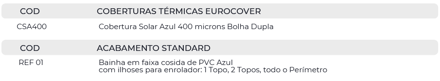 É constituída por uma película de polietileno translúcido, Azul Claro, com o propósito de aproveitar a luz solar transformando-a em energia térmica, para além de reduzir drasticamente a evaporação.