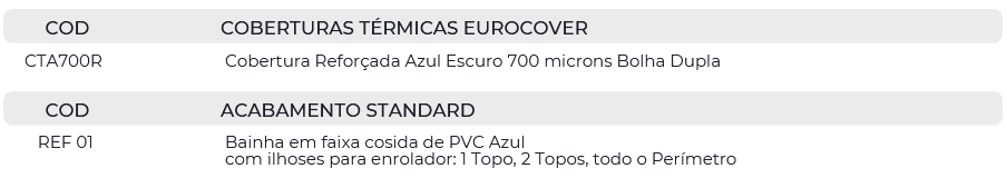 É constituída por uma película de polietileno de 700 microns Azul-Escuro opaca e uma película superior em ráfia, com o propósito de impedir a transmissão dos raios UV para a água da piscina. Reduz drasticamente a evaporação.