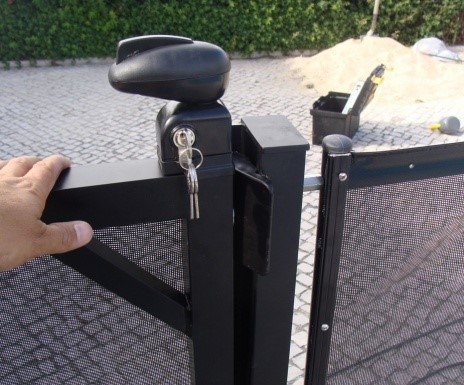 Fixações: os postes são aplicados numa fêmea de 10cm de aço inox que é fornecida com tampas próprias, para tapar os buracos sempre que a vedação não está instalada. Fixação para betão.